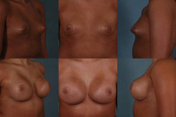 This case depicts one of the most challenging cases in breast surgery – the severe constricted breast anomaly. At times, extremely difficult to get an aesthetic result, this condition requires methodical intra-operative release of innumerable fibrous tight bands which internally deform the breast. Here, a patient is shown with a moderately severe variant (top 3 photos) and then after successful management (bottom 3). (From A cup to C cup) A dramatic improvement.