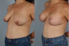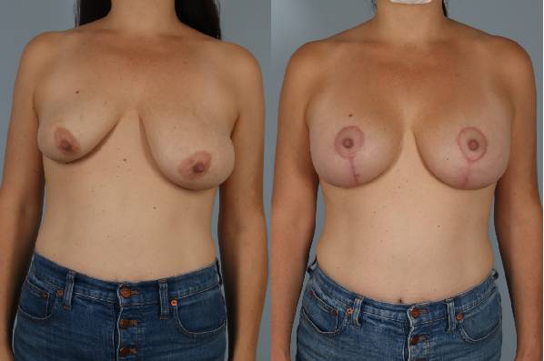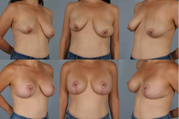 This patient presented with the challenge of uneven sagging breasts. The hallmark of my technique here is to reduce the breast volume as the lifting is done and simultaneously place an implant (under muscle). A great outcome.