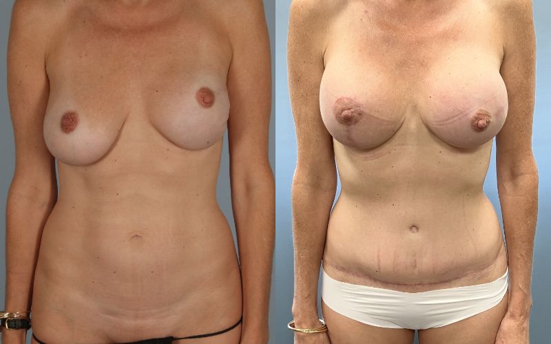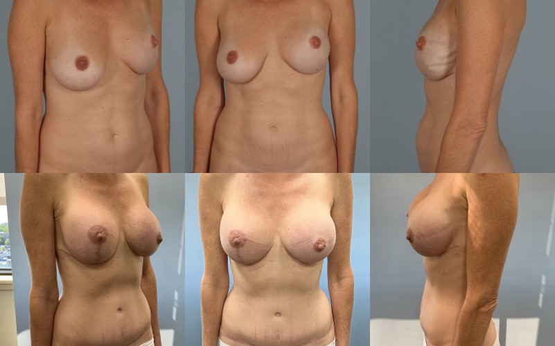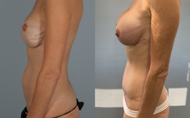 Post mastectomy breast reconstruction can be complicated especially when mastectomy is done only on one side. Obtaining a match can be elusive. This patient came to me after several attempts at a well known NYC institution with significant asymmetry, irregular breasts and pulled, scarred, malpositioned nipple. I redid everything! I released all scarring, replaced all muscle back, performed breast lift, and used my unique technique of Total 360 Alloderm wrap around implants in pre-pec reconstruction. I also did a tummy tuck! The results are magical and beautiful! You would never know she had her left breast removed. I specialize in post mastectomy reconstruction with implants especially revision implant reconstruction.