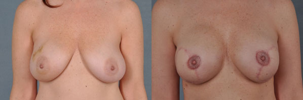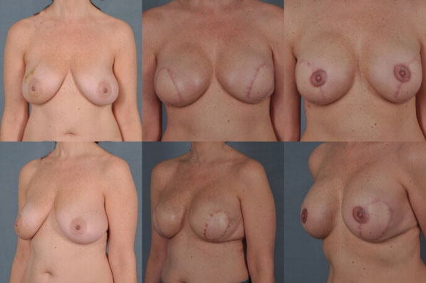 Bilateral latissimus flap and implants (silicone gel) was chosen. She is shown before mastectomy with breast sag. Latissimus flap allowed for lifting at time of reconstruction. Center views are just after mastectomy. She is then shown after nipple reconstruction and pigmentation. A very nice outcome and camouflaging of the potential mastectomy site deformity as well.