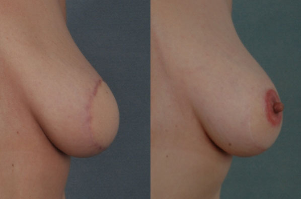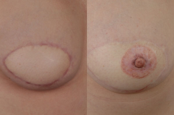 This case shows a patient who is undergoing the process of breast reconstruction. She is shown before nipple reconstruction and after nipple reconstruction. The subtle increase in volume overall in the post-op views (arrows) comes from fat grafting done at the time of nipple reconstruction.