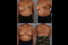 This patient presented with severe mastectomy deformity after loss of implant/expander from an infection. I performed Latissimus Flap and implant reconstruction to match her right side breast reconstruction. An amazing transformation shown again shortly after nipple reconstruction.