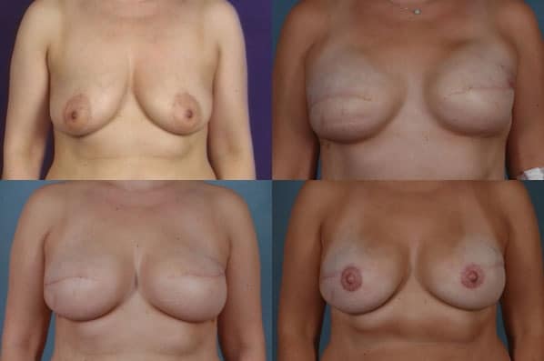 This case shows a patient in the top photos prior to bilateral mastectomies for breast cancer. The bottom three photos were taken after the necessary stages of breast reconstruction. These include tissue expanders at the time of the mastectomies, followed by shaping and placement of the implants three months later, and nipple reconstruction was performed three months after that. Notice the natural outcome of the nipple reconstruction.