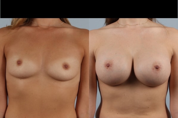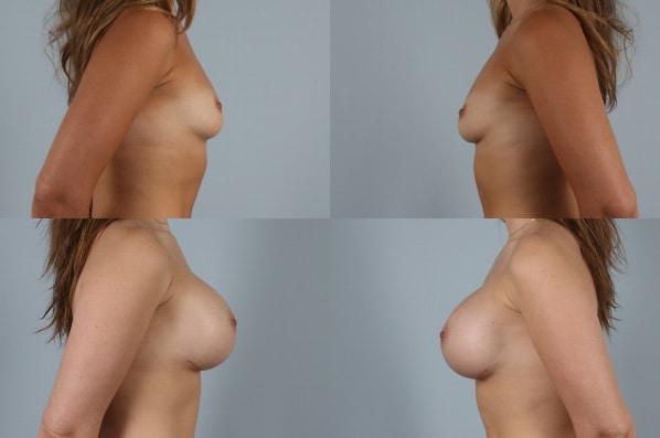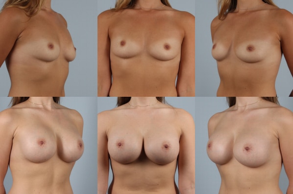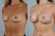 A cup to D cup augmentation using silicone gel implants placed under muscle, through an inframammary approach. The outcome, shown months later shows an idealized balance between upper and lower pole. A great result.