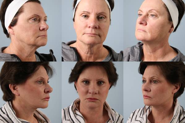 An amazing transformation using my combined approach to “natural face” facial rejuvenation, which includes fat grafting to multiple sites on the face where volume is lost over time (cheek, jaw line, corners of the mouth, lips), an upper and lower blepharoplasty and fat transposition (moving the lower eyelid bags down below the eye socket rim), lateral cheek lift to lift the cheek over thin fat, and SMAS Composite Face and Neck lift (combining muscle and skin tissue lift) in one procedure. Shown only 8 weeks post surgery. Amazing and beautiful transformation.
