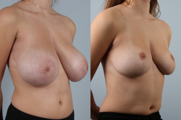 This young woman suffered from back, neck, and shoulder pains due to her extremely large breasts. She is shown after breast reduction from a HH cup to a small D cup. Months later, scars are barely visible. She has a great result and a new breast size and shape that fits her body well.