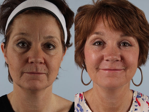 Combination brow lift and face and neck lift with cheek lift and upper and lower eyelid blepharoplasty has transformed her face to a youthful appearance of almost 20 years younger!