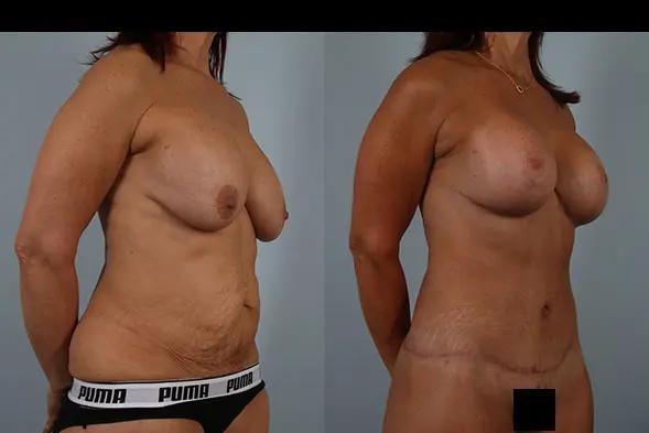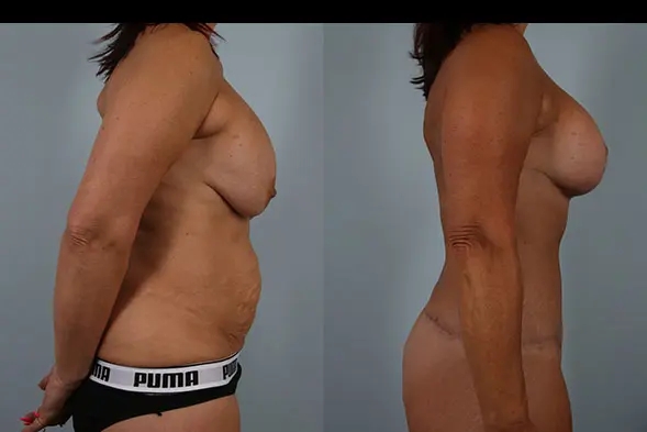 An amazing, total body transformation combining breast lift, capsulectomy, plus removal and replacement of implants. A total body lift including abdominoplasty was done along with diastasis repair, flankplasty, hip and buttock lift, liposuction of hips, and fat grafting of buttocks. The results transformed her body into a more youthful, beautiful figure!