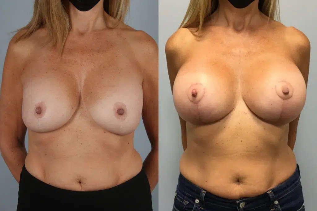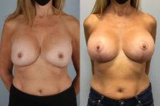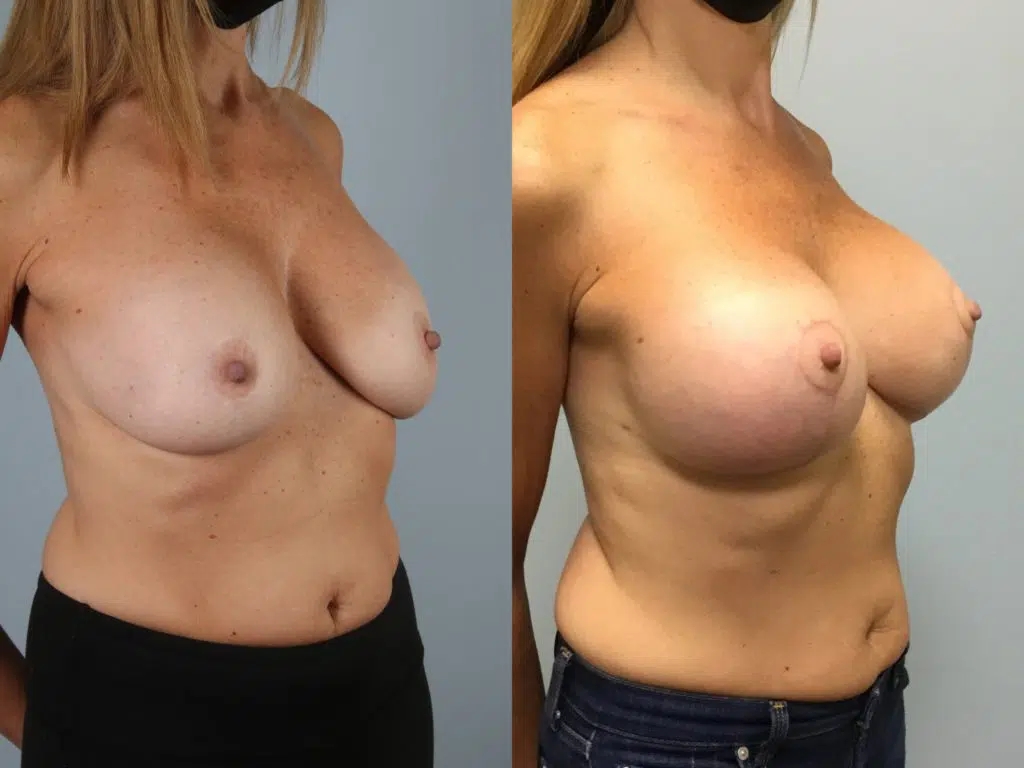 This patient presented with flat, wide breasts with sagging breast tissue down over the implants. In order to achieve the patient’s desired outcome of round, full, projecting breasts, I did total capsulectomy (removal of all implant related scar tissue), relifting and elimination of saggy breast tissue while placing a tissue graft sling (strattice) to hold the new implant position and enhance the roundness (like an internal bra). A great transformation.