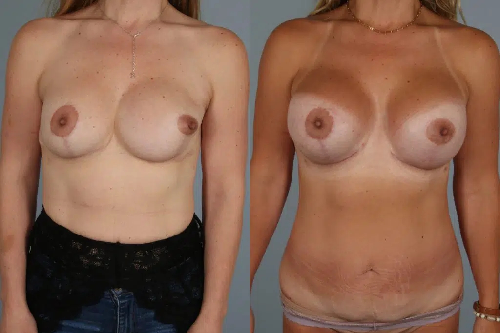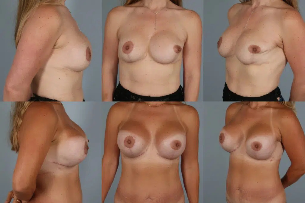 This patient presented to me after having many failed attempts elsewhere at correcting a congenital breast anomaly which left her with uneven, malshapen and disfigured breasts. The solution included correction of the symmastia, relocation of the nipple and areola and create new implant shape and space. This required total anterior capsulectomy, closure of the symmastia defect, creation of a new implant space, use of strattice tissue graft internal bra sling, selection of new implant, relifting and internal release of all contracted breast to allow redraping of the breast over implant. The results are beautiful, transformative, and life altering!