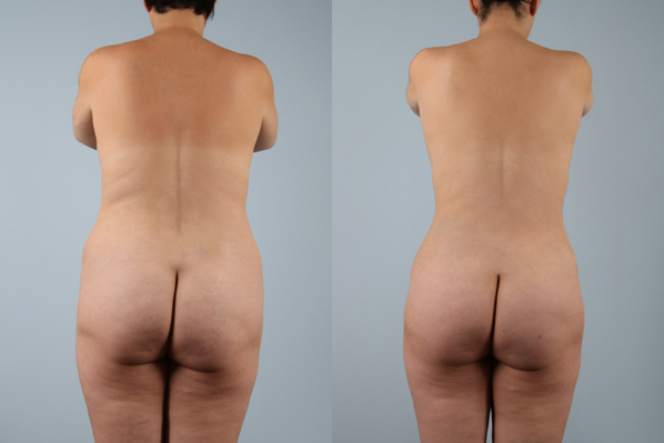 Liposuction of hips, back, and upper buttock, combined with fat grafting of lower and central buttock artistically create a more pleasing shape.