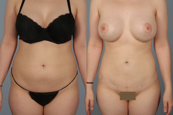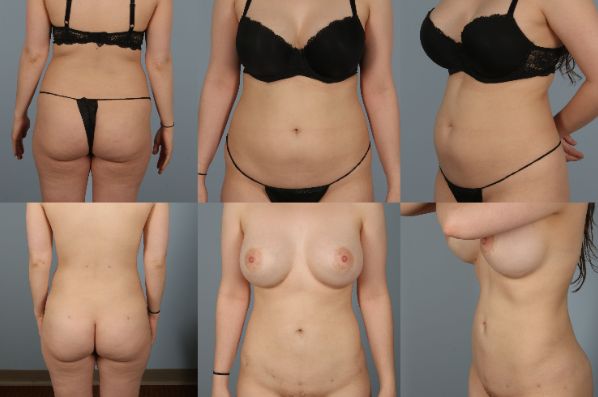 The patient underwent staged breast augmentation and total 360-degree torso circumferential liposuction including abdomen, flanks, hips, and hips which creates a beautiful and sensual shape!